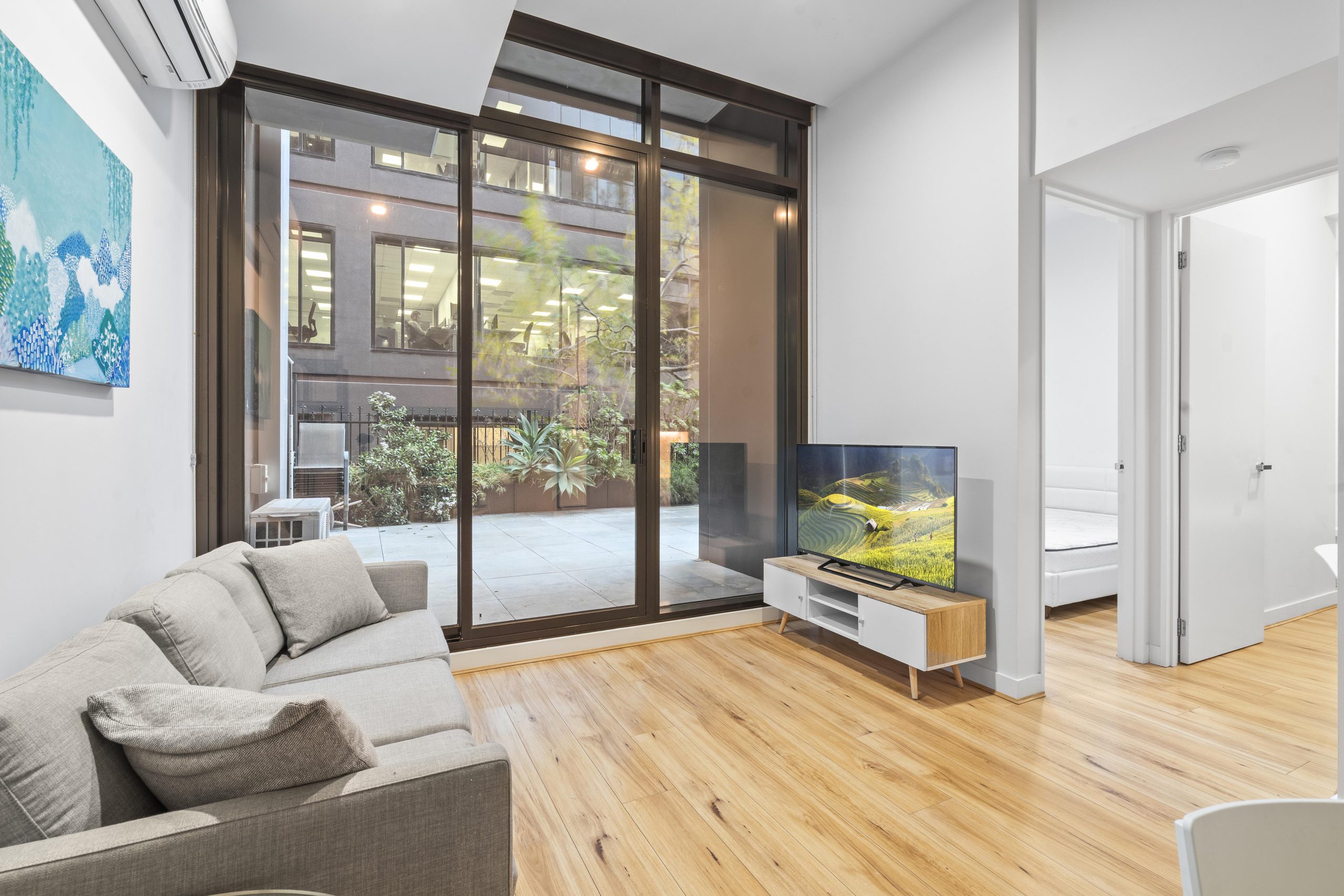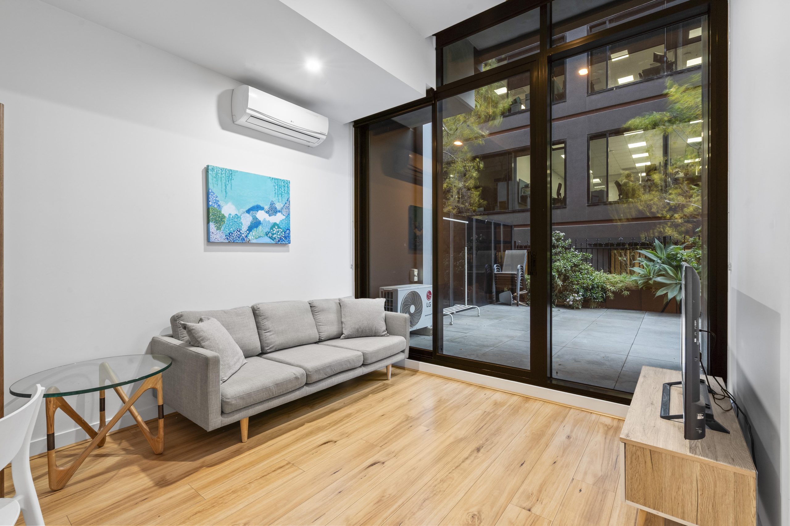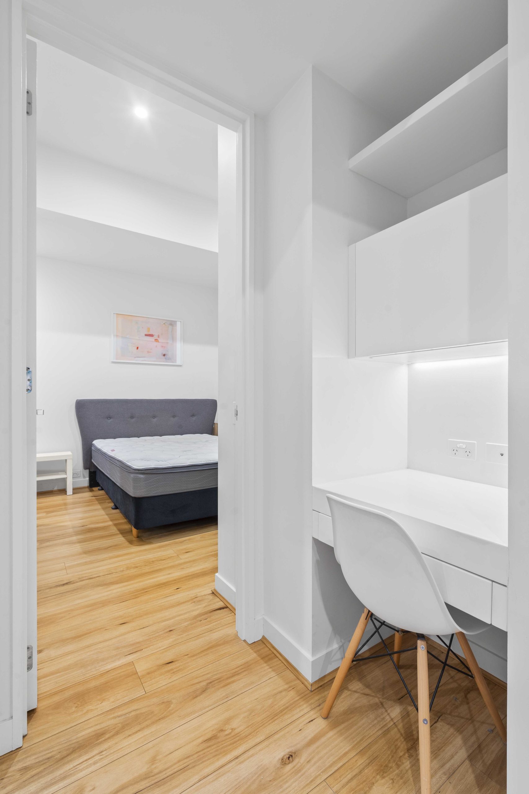 Both spacious bedrooms are fitted with mirrored built-in robes, with the master bedroom offering the added luxury of access to the courtyard via a study nook. A stylishly appointed bathroom features modern fixtures and a sophisticated design.